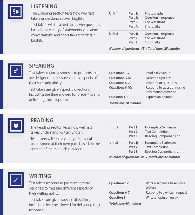 - Duración: 2:20 horas. (El examen oficial real de TOEIC 4Skills tiene una duración de 4h. Más información sobre el examen oficial aquí).